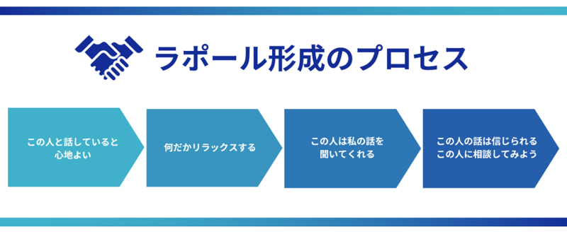 ラポールとはフランス語で「架け橋」の意味で、クライアントとカウンセラーの相互信頼関係を指す心理学用語です。ビジネスでも、ラポール形成により、顧客はもちろん、チームメンバーや上司・部下とのコミュニケーションが円滑となり、信頼関係を構築することができます。